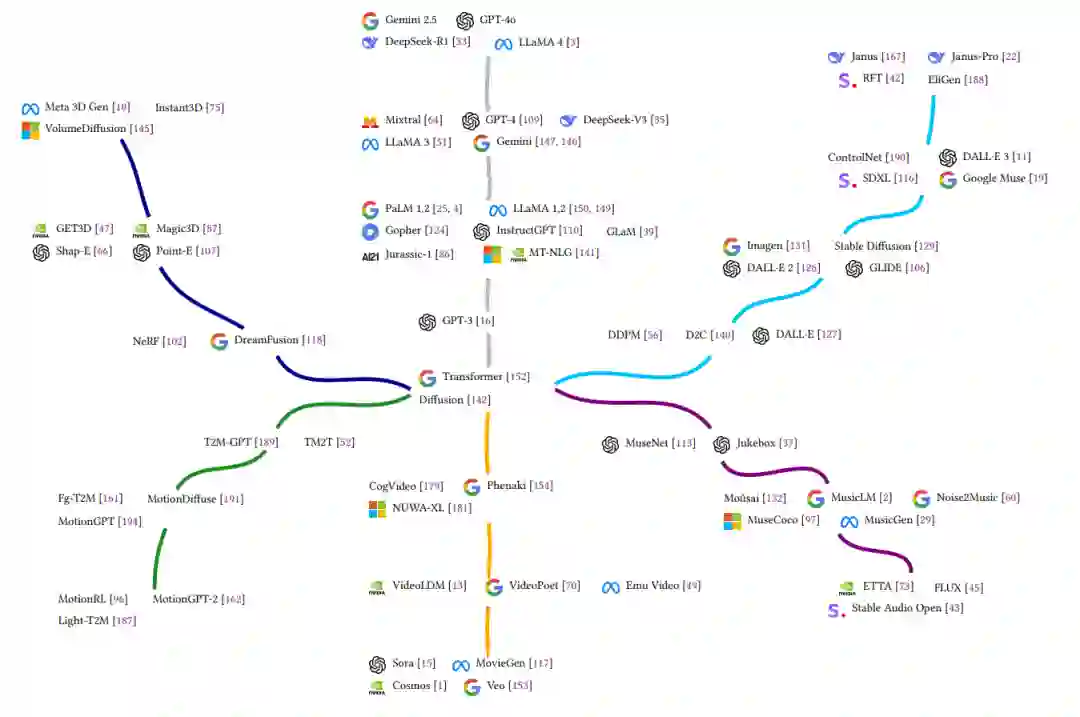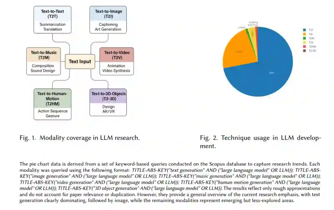 这六大类别代表了当前生成模型所涉及的主要模态,每种模态对应一种独特的数据输出形式与应用场景。本文将音乐单独归为 Text-to-Music(T2M),而非更广义的 Text-to-Audio,这是因为语音与文本关系密切,本质上是一种可直接相互转换的形式;而音乐则拥有与语言截然不同的结构、节奏、和声与创作元素,建模复杂性更高,因此值得单独对待。通过明确划分这些能力,我们希望强调生成模型所能覆盖的广泛输出范式,每种模式既有独特的应用场景,也伴随着专属的技术挑战。