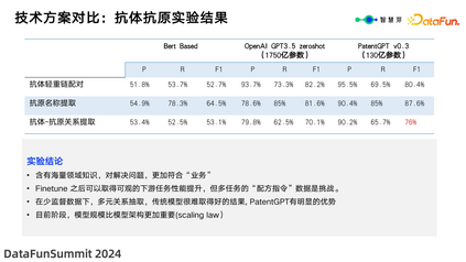 接下来分享应用专利大模型能够解决的实际业务问题。 上图显示了专利抽取的需求,一个生物医药客户需要从专利中获取抗体抗原的配对信息。这涉及到轻链、重链以及它们对应的抗原等关键数据,在生物医药领域至关重要。特别是对于大型药物公司,其核心药物都受到专利保护,因此准确提取这些信息至关重要。然而,在过去,数据集的准确性和提取都需要人工干预。要实现客户的需求,使用纯人工方法完成需时 5 个月;使用小型模型结合人工标注(并由人工审核)需时 2 个月;而通过专利大模型,经过 Lora 微调、全参数微调、指令微调等方案,仅需 4 天即可完成任务。**7. **技术方案对比:抗体抗原实验结果