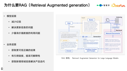 (2)在业务层面: * 获得更可信的正确结果。尤其是在生成涉及侵权或法律方面的结果时,对精度的要求非常高。 * 有引用链接,提高可解释性。当客户获取生成的结果时,通常要求其具有可解释性和可追溯性,以证明整个链路的可信性。因此,每个回答都必须提供相应的链接地址,这也是产品需求的一部分。 * 获得新增领域信息以解决产品迭代问题。因为模型更新需要产品迭代,因此如果需要在短期内立即上线,RAG 是一个可行的解决方案。