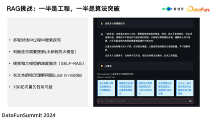 在 RAG 的实施过程中,上图中展示了其中一个例子:“发烧多少度需要吃药”,模型给出了回答,接着问:“儿童呢”这意味着询问小孩发烧多少度需要吃药。系统首先需要确定是否涉及多轮对话,然后判断是否需要搜索。这个例子中模型判断是多轮对话,Query 需要进行改写;如果不是,可以直接利用当前问题进行搜索。在实践中面临的挑战包括: * 在多轮对话过程中进行搜索改写。 * 判断是否需要搜索,通过小参数的大型模型来解决这个调度问题。 * 搜索与大型模型的深度融合(SELF-RAG),当大模型直接生成内容时,通过生成特殊的 token 来指示是否需要搜索。 * 100 亿向量的性能问题,RAG 的应用需要对源数据进行 Chunking 分段,将上百页的专利分成多个部分。如何通过工程化方法使其运行更快,也是一个挑战,这涉及到工程化的问题。