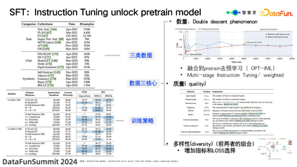 若要提高单个任务的精度,也有许多方法可供选择,例如扩大数据集规模、增强多样性。此外,如果 7B 模型不足以满足需求,可以考虑使用 13B 模型,甚至 70B 模型。 (3)数据三核心:数量、质量和多样性 数量:SFT 训练数据数量的增加存在双降的规律。当数据量为几千条的时候,训练的 loss 会快速下降;随着后续任务的不兼容或产品化需求的提出,数据量会不断增加,此过程中损失也会相应上升。这一问题在智慧芽的实际生产中也经常遇到。以下是几种解决思路: * 将数据融合到预训练中进行预学习(OPT-IML),这实际上是有效的; * 采用多阶段学习而非一次性学习,这也是智慧芽大模型的整体思路,即分阶段进行训练; * 使用数据权重,对 SFT 中不同的数据设置不同的损失权重,对于专家标注的数据,可以设置较大的损失权重,以加快损失的下降速度;对于自动生成或合成的质量较低的数据,可以设置较小的损失权重。