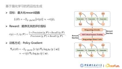 基于策略梯度的训练方法中,其重一个广为人知的方法是使用一个 baseline 减少梯度估计的方差,从而增加训练的稳定性。因此我们使用了基于 SCST 的训练方式,即 Self-critical sequence training 方法。baseline 同样来自于模型自身生成的这个药品包所获得的 reward,自己生成的方式我设计为 Greedy search 的正常序列生成方法。我们希望模型根据 Policy gradient 采样出来的药品包的 reward 要高于传统给予 Greedy search 生成出来药品包。基于此本文设计了强化学习的损失函数,如图中所示,这里就不详细的介绍推导过程。