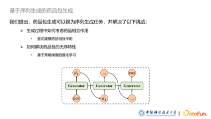 药品包生成任务可以视为一个序列生成任务,采用循环神经网络 RNN 实现。但此方法也带来了两大挑战: 第一个挑战是在生成过程中如何考虑生成出的药品和已有的药品之间的相互作用。为此我们提出了一种基于药品相互作用向量的方法显式建模药品之间的相互作用。第二个挑战是样品包是一个集合,本质是无序的,但是序列生成任务往往针对有序序列顺序的方法。为此我们提出了一种基于策略梯度的强化学习方法,同时增加了基于SCST的方法来提升此算法的效果和稳定性。