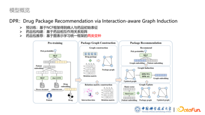 **本文提出的论文题目是 DPR:Drug Package Recommendation via Interaction-aware Graph Induction。模型包括三个部分:**预训练部分,我们基于 NCF 框架得到病人与药品初始表征。药品包构建部分,我们提出了一种基于药品相互作用关系类型,将药品包构建成药品图的方法。最后一个部分是基于图的药品包的推荐框架,其中设计了两个不同的变种,从两种不同的角度去理解如何建模药品之间的相互作用。