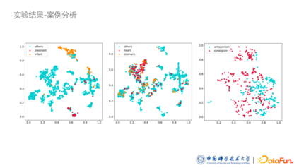 最后我们也做了大量的案例分析,可以看到孕妇和婴儿有明显的个性化偏好。同时我们额外加了一些常见病如胃病、心脏病等,这些病的掩码向量则分布非常分散,没有形成簇。常见病的患者情况多种多样,不会有特别个性化的情况出现,不像孕妇和婴儿有着非常明显的对于药品的筛选,如某些需要指定小儿药品,有些药品孕妇不能使用等。同时我们对药品的相互作用向量进行了投影,可以看到协同作用和拮抗作用两种药品相互作用形成了两个不同的对立情况,说明模型捕捉到了两种不同相互作用带来的不同效果。