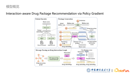 接下来是发表在 TOIS 的 Interaction-aware Drug Package Recommendation via Policy Gradient 文章。文中提出的模型叫做 DPG,不同于上一篇的 DPR,这里的 G 是 Generation。此模型主要包含三个部分,分别是药品相互作用图上的信息传播,病人的表征以及药品包生成模块,与上文的最大的区别是药品包生成模块。