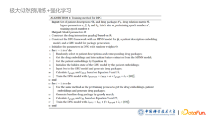为了研究药品之间的相互作用,我们从 DrugBank 与药制网两个大型在线开源药品知识库里收集了部分药品的属性及相互作用数据。药品相互作用是基于一些模板的自然语言描述,如上图中 description 一栏是在讲某种药品可能可以增加代谢或减弱代谢等,中间话是模板,前后是填充的药品名字。因此只要清楚模型分类,则可以把数据库里所有的药品相互作用进行标记。因此,**我们在专业医师的指导下,把药品相互作用考虑了无相互作用、协同作用和拮抗作用三类,把模板进行了标注,得到了药品相互作用的分类。