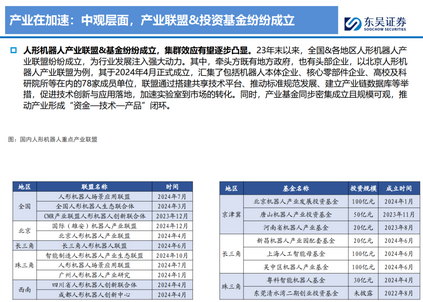产业明显提速,差异化渐显,短期工业场景有望率先落地,长期空间广阔。1)产业在加速:产业政策密集出台,产业联盟&基金纷纷成立,融资数量大幅增长,推动产业形成“资金—技术—产品”闭环。2)差异化渐显:国内机器人在上下肢、视觉等硬件方案及模型路线等软件层面存在差异化且仍未收敛。3)短期爆发在即,长期空间广阔:应用环节较为明确为汽车、3C行业,有望率先起量,逐步延伸至其他制造业及搬运、零售等服务业,有望于2030年走进家庭。据测算,预计2030/2035年机器人新增需求达178/994万台。随大脑逐步完善及场景拓宽,关节数增加,线性关节逐步渗透,灵巧手收敛至五指方案,我们测算2035年大批量生产后,单体执行器价值量约6万元,旋转/线性执行器市场空间达2130/4031亿元。 初创机器人企业:背景多元,量产在即,潜力无限。我们梳理了智元、宇树、优必选、乐聚、普渡、傅利叶、银河通用、众擎、星动纪元、千寻智能共10家企业,初创企业机制较为灵活,创始团队在某一领域(运动控制为主)背景深厚,2024年头部企业均发布最新机型,具备双足机器人的开发能力,并与车企等制造企业试点近半年,小批量测试阶段有望结束,25年开启量产销售,多家企业预计2025年全年销售超千台。我们认为:1)智元、宇树、优必选、乐聚进度较为领先,在全栈式布局、硬件性能&成本控制、场景应用、股东背景等领域具备优势;2)银河通用、星动纪元、众擎、千寻智能则在大模型、运动控制算法等细分方向较为领先;3)普渡、傅利叶由原本配送/康复机器人拓展,硬件&量产能力优秀。 互联网&整车企业:多元形式入局,推动产业加速。1)互联网企业:多以投资&大模型&自研方式入局,关注软件端的大模型高于关注硬件,从“大脑”方面发力。目前国内互联网企业多集中于语言模型,也纷纷推出自研多模态大模型,也在往具身智能大模型方向发展,但与海外龙头企业仍有一定差距。其中,华为布局较为多样,模型端—盘古大模型较为领先,志在让人形机器人成为鸿蒙生态系统重要部分,车端—场景&制造资源协同,共同赋能国产人形机器人,投资端—注资极目机器人,加大投入。3)整车企业:人形机器人在“感知+决策+执行”层面与智能驾驶均具备共同性,同时车企在应用端也是天然的落地场所,目前在智能驾驶投入层面华为于研发人员&算力规模均国内第一,有望于人形机器人领域延续领先地位。