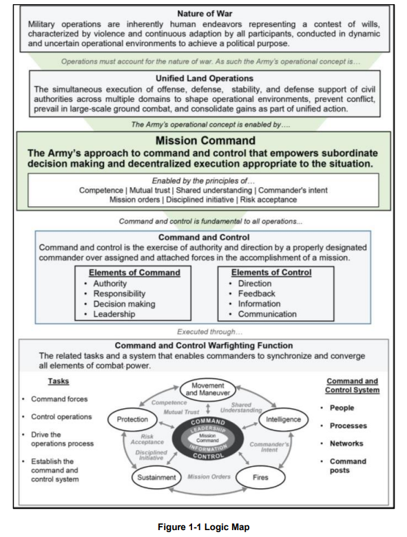 本出版物根据指挥与控制的作战职能进行了更新,而以前的版本是在理论上仍然提到任务指挥作战职能的时候编写的。指挥与控制是指适当指定的指挥官在完成任务的过程中,对指派的和附属的部队行使权力和指导(参考JP 1)。陆军将任务指挥定义为陆军的指挥和控制方法(也称为C2),它赋予下属决策权和适合情况的分布式执行权(ADP 6-0)。为了协助指挥部队和控制行动,指挥官建立了他们的指挥和控制系统,即人员、程序、网络和指挥所的安排,使指挥官能够开展行动(ADP 6-0)。有效的指挥官使用本出版物来提高他们的指挥和控制系统的准备状态,以确保他们的部队准备好进行统一的地面行动。