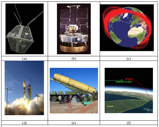 其中,反卫星(ASAT)导弹试验将是产生碎片的主要原因,我们在图1(a-f)中汇编了一些与反卫星有关的历史事件。世界上第一次反卫星导弹试验是在1970年2月由苏联对一个特殊的目标航天器DS-P1-M进行的。美国于1985年9月13日完成了针对伽马射线光谱学卫星Solwind P78-1的首次成功的反卫星导弹试验。这次试验产生了285块编入目录的轨道碎片。2008年2月21日,美国海军摧毁了发生故障的美国间谍卫星USA-193[10],2015年11月18日,俄罗斯的直接升空反卫星导弹的飞行试验[11],以及2019年3月27日,印度的试验。
