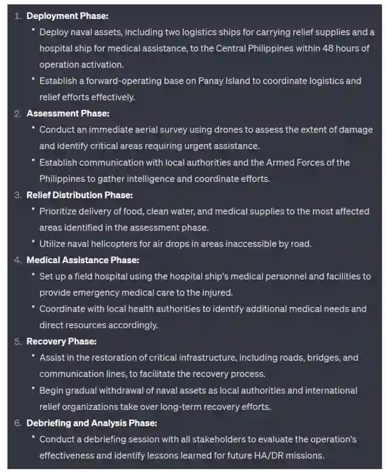 在此,使用 ChatGPT 生成了一个基于以下指挥官意图的虚构作战计划样本: "我的意图是支持菲律宾武装部队在菲律宾中部受灾地区开展人道主义援助和灾难响应(HA/DR)行动。我们将提供一切可用的援助,以减轻人类痛苦并恢复正常状态"(图 1)。