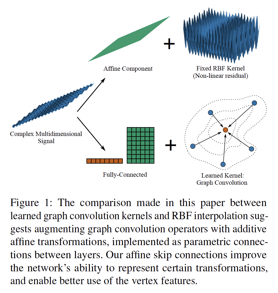 摘要:图卷积操作为以前认为遥不可及的各种图形和网格处理任务带来了深度学习的优势。随着他们的持续成功,人们希望设计更强大的体系结构,这通常是将现有的深度学习技术应用于非欧几里得数据。在这篇文章中,我们认为几何应该仍然是几何深度学习这一新兴领域创新的主要驱动力。我们将图神经网络与广泛成功的计算机图形和数据近似模型(径向基函数(RBF))相关联。我们推测,与RBF一样,图卷积层将从向功能强大的卷积核中添加简单函数中受益。我们引入了仿射跳跃连接 (affine skip connections),这是一种通过将全连接层与任意图卷积算子相结合而形成的一种新的构建块。通过实验证明了我们的技术的有效性,并表明性能的提高是参数数量增加的结果。采用仿射跳跃连接的算子在形状重建、密集形状对应和图形分类等每一项任务上的表现都明显优于它们的基本性能。我们希望我们简单有效的方法将成为坚实的基准,并有助于简化图神经网络未来的研究。