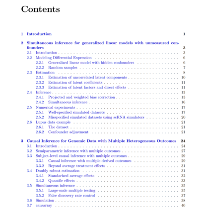 在基因组研究中,通常会进行成千上万次的统计假设检验,以识别与疾病相关的因果基因。最近,单细胞RNA测序和CRISPR技术的进展使得基因表达能够以高分辨率进行测量。然而,这些数据通常是稀疏的、过度离散的且具有异质性,这为多个因果效应的可靠推断带来了重大挑战。本论文提出了三种互补的解决方案: (1) GCATE 是一种统一的基于模型的框架,用于具有潜在混杂因素的广义线性模型。通过利用正交结构和线性投影,GCATE 使得在非线性模型下对直接效应进行一致性估计和推断成为可能。在样本量和响应量都接近无穷大的高维情境下,我们推导出了渐近z检验的I型误差控制,并通过Benjamini-Hochberg方法在经验上演示了假发现率(FDR)的控制。通过比较来自两组样本的单细胞RNA测序计数,我们展示了在模型中缺乏显著协变量时,调整混杂效应的适用性。