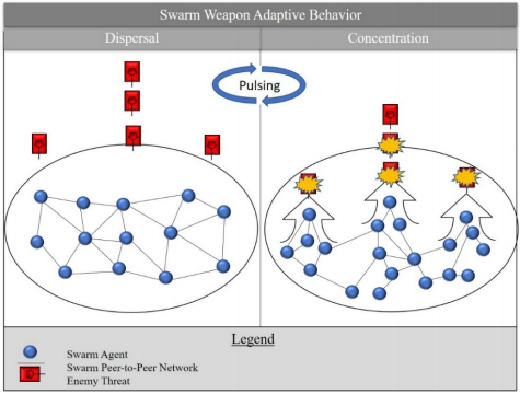 今天,无人机技术的成本降低,使这些蜂群智能算法能够过渡到现实世界。中国和美国都已经展示了他们操作一百架无人机群的能力。例如,在2016年,美国战略能力办公室展示了从F-18飞机的飞行中发射的103架无人机群。现在,同一个小组正在开发一个1000架无人机群。本文将重点讨论蜂群的武器化。由于该技术刚刚出现,研究人员对蜂群武器的论述非常少。这也是一个复杂的、有争议的话题,但却是一个重要的话题,因为这些武器有可能大大塑造战场的优势或劣势。到目前为止,作者们所写的关于蜂群武器的文章主要集中在蜂群的数量优势或压倒先进武器系统的能力上。尽管蜂群武器确实可以提供这种能力,但这只是触及了其真正潜力的表面。蜂群武器对敌人动态行动的实时反应能力使蜂群能够迅速改变状态和行为。有了这一点,你可以设计蜂群的行为,使之与军事理论和战争原则相一致。通过设计行为,你可以创造出一种蜂群武器,它能够在搜索目标时保持分散状态,然后根据敌人的行为迅速集中到一个、两个、三个或数百个目标上(图2)。在联合作战原则中,这种脉冲能力整合了机动性和质量原则,以便在深度和广度上攻击敌人。下面将论证这一概念是可行的,并可能在未来十年内对战场产生颠覆性影响。