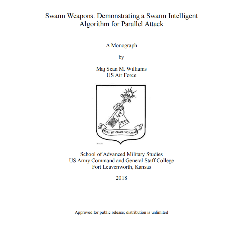 这提供的优势是能够进行约翰-沃顿上校定义的并行攻击,且规模空前。为了论证这一点,本文将首先通过回顾现有的研究和文献,分析未来十年在技术上的可行性。接下来,这项研究工作将开发一个使用并行攻击概念的蜂群武器概念。然后,本文将在计算机模拟中展示这项研究工作设计的蜂群智能算法。本文将表明,在未来十年内,开发一种能够进行并行攻击的蜂群武器是可行的。通过在其他相同的武器中加入蜂群智能,蜂群算法使这些武器更加高效和致命。这项研究工作的结果可以为蜂群武器的多种新的使用概念奠定基础,包括蜂群突破、蜂群区域防御、蜂群并行攻击和蜂群在有争议环境中的广域侦察。