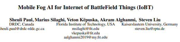 新的机制为士兵提供了自动化能力,包括在战场等有争议的环境中进行交互、移动、快速、可扩展、安全、强大的计算通信。战场物联网(IoBT)是一项为未来战争开发综合物联网(IoT)解决方案的技术。IoBT 将士兵与装甲、无线电、武器、弹药、健康传感器、全球定位系统等其他物体以及各种物联网设备中的智能技术连接起来。这些 “物”、物体或受限设备可以相互通信,也可以通过现有的网络基础设施(如互联网或网络网格)进行通信。它们在内存存储、计算能力和能源方面的容量大多有限。物联网、网络(设备通信 (D2D)、点对点通信 (P2P))、机器智能、多模态传感和融合是开发跨学科 IoBT 网络所涉及的一些领域。我们的目标是为士兵配备由人工智能驱动的物联网设备。现有的基于 D2D/P2P/LPWAN 的物联网技术主要集中在边缘计算设备上,这些设备速度慢、不安全且缺乏足够的可扩展性,因此局限性很大。我们提出了一个新概念,即用于 IoBT 的移动雾人工智能,以克服现有 IoBT 的局限性。