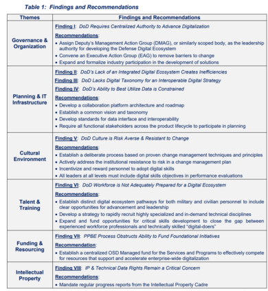 小组委员会的结论是,美国防部和国防工业基地(DIB)正在进行的数字化工作发展迅速且极其复杂。小组委员会很快认识到不可能对这些活动进行全方位的审查,因此将调查重点放在那些会直接影响和加速我军研发、采购、维持和作战的领域。