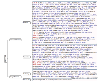 3 训练管道MM-LLMs训练流程可以被划分为两个主要阶段:MM PT和MM IT。3.1 MM PT在PT阶段,XText数据集被广泛用于训练模型。训练过程中,输入和输出投影器得到优化,确保准确对齐各种模式。MM理解模型主要优化公式(2),而MM生成模型则涉及公式(2)、(4)和(5)。XText数据集包含图像文本、视频文本和音频文本等多种文本数据,其中图像文本又分为图像文本对和交错的图像文本语料库。详情请参见附录G表3。3.2 MM ITMM IT是一种方法,通过使用指令格式化的数据微调预训练的MM-LLMs,提高零击性能。MM IT包括监督微调(SFT)和人类反馈驱动的强化学习(RLHF),旨在增强MM-LLMs的交互能力。SFT将PT阶段数据的一部分转换为指令感知格式,使用相同的优化目标微调预训练的MM-LLMs。SFT数据集可以是单回合QA或多回合对话的结构。在SFT之后,RLHF涉及进一步的微调模型,依赖于有关MM-LLMs响应的反馈(例如自然语言反馈(NLF)手动或自动标记)。此过程使用强化学习算法来有效地集成不可微分的NLF。模型根据NLF进行训练以生成相应的响应。4 SOTA MM-LLM图3展示了我们对122篇SOTA MM-LLM的功能和设计分类。设计方面分为“工具使用”和“端到端”两种方式。我们对这些模型中的43个架构和训练数据集规模进行了比较,如表1所示。开发趋势包括从MM理解到任意模式转换,改进训练管道以更好地与人类意图对齐,接受多样化扩展模式,纳入更高质量的训练数据集,并采用更有效的模型架构。MM-LLM现有趋势: