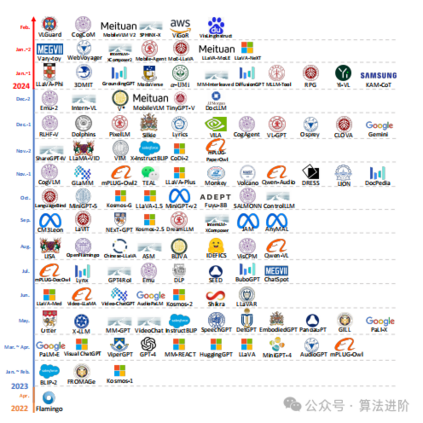 5 基准和性能为了比较不同视觉语言基准上的主要MMLLMs,我们整理了一个表格,其中包含来自各种论文的信息,如表2。为了解决高分辨率导致更长的令牌序列和额外训练成本的问题,一些论文提出了解决方案。其中,Monkey提出了一种解决方案,仅使用低分辨率视觉编码器提高输入图像的分辨率。此外,高质量的SFT数据可以显著提高特定任务的性能。VILA揭示了几项关键发现,包括在LLM后端上执行PEFT促进深度嵌入对齐的重要性,交错的图像-文本数据是有益的,而单独的图像文本对是不够理想的。在SFT期间重新混合仅包含文本指令数据与图像文本数据不仅可以解决纯文本任务性能下降的问题,还可以提高VL任务的准确性。表2 主流MM-LLMs在18个VL基准上的比较。红色表示最高结果,蓝色表示第二高结果。‡表示ShareGPT4V(Chen等人,2023f)重新实现的测试结果,这些结果在基准或原始论文中缺失。*表示在训练过程中观察到训练图像。 6 未来方向本节研讨了MM-LLMs在以下多个领域中所展现出的充满潜力的未来发展趋势:**更强大的模型。**增强MM-LLMs的四个关键领域:(1)扩展模式:将MM-LLMs扩展到其他模式,如网页、热图和图表,以增加模型的通用性和普遍适用性;(2)多样化的LLM:整合各种类型和大小的LLM,提供根据具体要求选择最合适LLM的灵活性;(3)提高MM IT数据集质量:改进和扩展MM IT数据集,提高MM-LLMs在理解和执行用户命令方面的有效性;(4)加强MM生成能力:探索整合基于检索的方法,增强模型的整体性能。**更具挑战性的基准。**现有的基准可能不足以全面评估MM-LLMs的能力,因为它们可能已在训练过程中熟悉这些任务。当前基准主要集中于VL子领域,因此为MM-LLMs开发一个更具挑战性的、包含多种模式和统一评估标准的更大规模基准至关重要。例如,GOAT-Bench和MathVista分别用于评估MM-LLMs在识别社会虐待微妙方面和视觉上下文中的数学推理能力。MMU和CMMMU是为专家AI设计的英语和中文多学科MM理解与推理基准。BenchLMM评估MM-LLMs的跨风格视觉能力,而Liu等人则深入研究了MM-LLMs的光学字符识别能力。**移动/轻量级部署。**为了在资源受限平台上部署MM-LLM并实现最佳性能,需要采用轻量级实现。近年来,已经进行了许多类似的研究,通过比较性能或最小损失实现了有效的计算和推理。然而,这一领域仍需要进一步探索以取得进一步的进展。MobileVLM是一种显著的方法,通过降低LLaMA的规模和引入轻量级的下采样投影器,实现了无缝的现成部署。**实体智能。**实体智能是一种旨在通过理解环境、识别对象、评估空间关系和制定任务计划来复制人类对周围环境感知和交互的人工智能技术。PaLM-E和EmbodiedGPT是该领域的典型工作,前者通过训练MM-LLM引入多身体代理,处理通用VL任务,后者提出经济高效的CoT方法,增强实体代理与现实世界的互动能力。尽管基于MM-LLM的实体智能在机器人集成方面取得进展,但需要进一步探索来增强机器人的自主性。**持续学习。**MMLLMs由于训练成本高,不适合频繁重新训练,但为了更新技能和跟上人类知识,更新是必要的。因此,持续学习(CL)是必要的,分为持续的PT和持续的IT。最近提出了连续MMIT基准,用于在原始MMIT阶段学习任务的同时,为MM-LLMs连续微调提供新MM任务的能力,同时保持对已学习任务的优异性能。这引入了两个主要挑战:灾难性遗忘,即模型在学习新任务时忘记以前的知识,以及负向正向转移,表明在尝试新任务时性能下降。**减轻幻觉。**幻觉是指在没有视觉线索的情况下生成文本描述的生成对象,可能出现在多种类别中,如描述中的误判和不准确。幻觉的根源包括训练数据中的偏见和注释错误,以及段落分隔符相关的语义漂移偏见。当前缓解幻觉的方法是利用自我反馈作为视觉线索,但挑战仍然存在,需要区分准确和幻觉输出,并在训练方法上取得进展以提高输出可靠性。MM-LLMs的最新进展链接:https://mm-llms.github.io