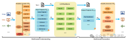 图1 MM-LLMs的时间轴2 模型体系结构本节概述了构成通用模型架构的五个组件,如图2所示,包括模式编码器、LLM主干、模式生成器和输入输出投影器。MM-LLM仅包括前三个组件,在训练过程中,模式编码器、LLM主干和模式生成器通常保持冻结状态,主要优化重点在于输入和输出投影器。MM-LLM中可训练参数的比例与总参数数量相比明显较小,通常约为2%。总体参数数量取决于MM-LLM中使用的核心LLM的规模。因此,MM-LLM可以高效地训练以支持各种MM任务。 图2 MM-LLMs的一般模型架构以及每个组件的实现选择。2.1 模态编码器模态编码器(ME)将来自不同模态的输入IX编码为相应的特征FX。