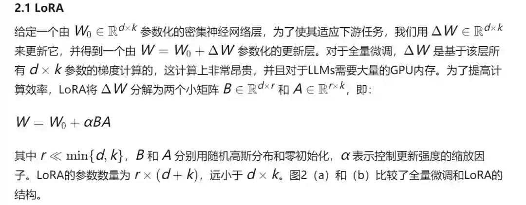 然而,对LLM进行全参数微调(即全量微调)计算开销极其巨大,例如,对LLaMA2-7B[3]模型进行全量微调需要大约60GB的内存,超出了普通消费级GPU的容量[4]。为了减少计算成本,提出了各种参数高效微调(PEFT)方法[5]。这些方法通过只微调少量(额外的)模型参数来使LLMs适应下游任务。从是否涉及额外参数的角度来看,PEFT方法可以分为两类:额外参数方法和内部参数方法。额外参数方法冻结LLM的所有原始参数,并插入一组可学习的参数来优化模型输入或模型层,如适配器调优[6]和提示调优[7]。相比之下,内部参数方法冻结LLM的大部分原始参数,只微调LLM的一小部分参数,如BitFit[8]、LISA[4]和LoRA[9]。 在无法修改模型架构的情况下,内部参数方法是理想的。在内部参数方法中,LoRA是使用最广泛的方法,因为它在多个下游任务上可以实现与全量微调相当或更好的下游适应性能[9],且易于实施。此外,还提出了许多变体,以进一步提高LoRA在更具挑战性的下游任务中的适应能力。