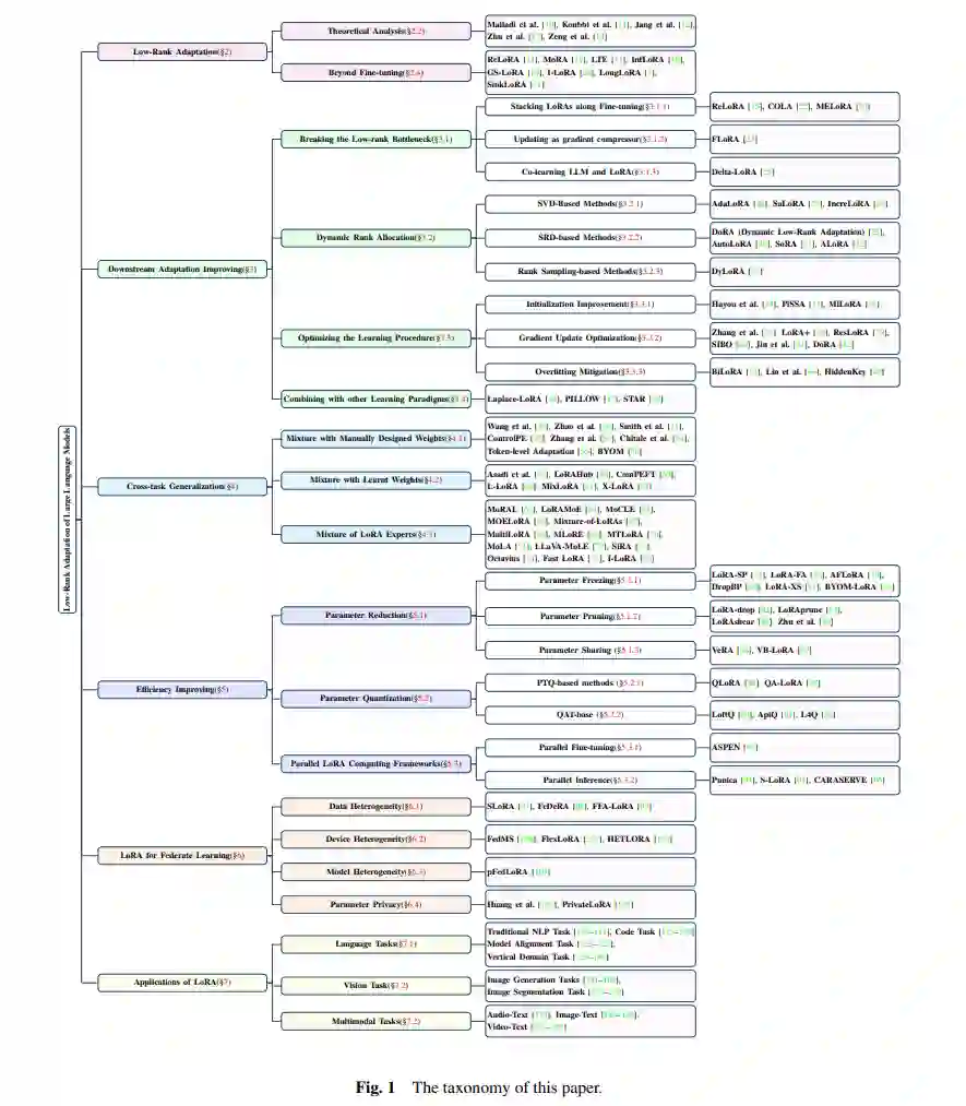 本综述的其余部分组织如下。第2节介绍了LoRA的背景知识,第3节介绍了旨在提高下游适应性能的LoRA变体。在第4节中,我们回顾了混合LoRA插件以实现跨任务泛化的方法。第6节介绍了LoRA驱动的联邦学习方法。第7节报告了LoRA的应用。第8节总结了本综述并讨论了未来的研究方向。