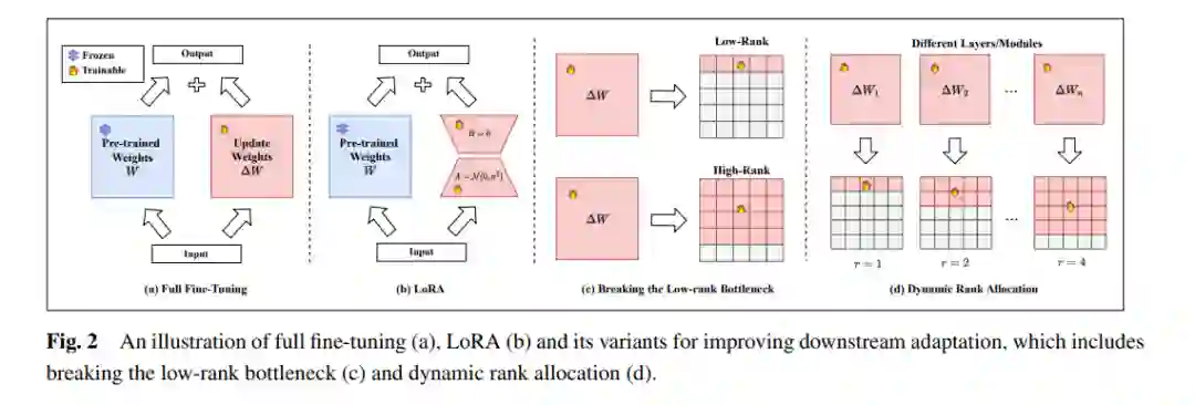 尽管LoRA在某些下游任务上可以实现适当的适应性能,但在许多下游任务上(如数学推理[200-202]),LoRA与全量微调之间仍存在性能差距。为填补这一差距,许多方法被提出以进一步提高LoRA在下游任务中的适应性能。通常,现有方法从以下几个角度改进下游适应性能: 1. 突破低秩瓶颈,参见图2(c); 1. 自适应分配不同LoRA模块的秩,参见图2(d); 1. 优化LoRA的学习过程; 1. 与其他学习范式结合。