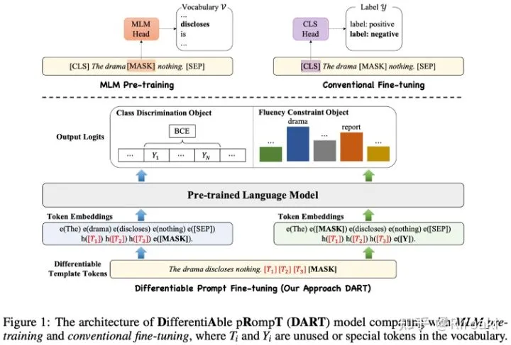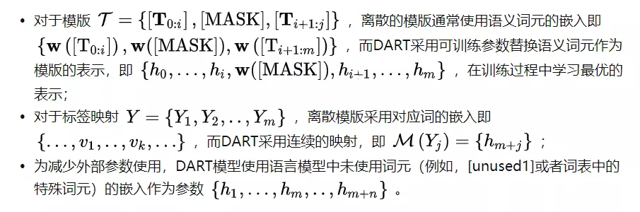 二、动机 提示学习通过引入任务相关的模版和标签映射,将一般的分类任务转换为和语言模型预训练过程中遮盖文本建模(Masked-Language Modeling)目标一致的形式,因而如何选取合适模版和标签映射就成为其核心。从PET的手工构建模版,到AutoPrompt和LM-BFF等工作基于梯度或者生成模型选取离散模版词,再到P-tuning引入外部架构并从任务中学习连续化模版词,可以看出提示学习的工作经历了从离散到连续、从手工到自动的演进过程,类似于人工智能领域从特征工程到深度学习的范式变化。有鉴于离散化模版词的非最优性,本文提出的DART(DifferentiAble pRompT)方法采用了一种简单的构造方式,可以在任务中同时学习连续化的模版和标签映射。