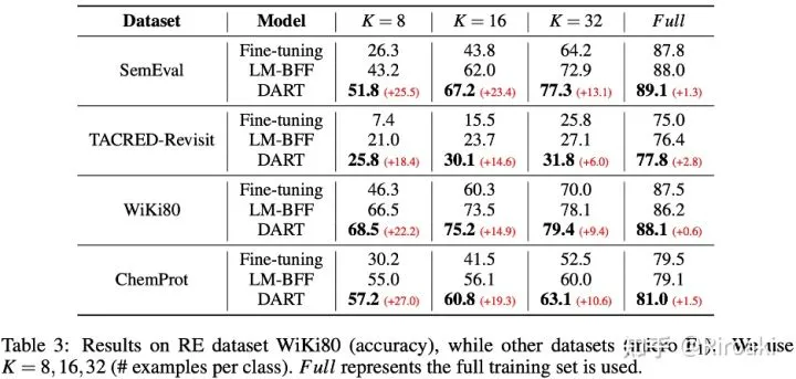 四、实验分析 本文列出了DART模型在15个NLP数据集上的表现,包括情感分析、自然语言推理、释义、句子相似度、关系抽取和事件抽取的多种任务,其中涵盖主流的句子分类数据集如SST-2、MR、CR、Subj、TREC、MNLI、QNLI、MRPC和QQP等,以及多种关系/事件抽取数据集如SemEval 2010、TACRED-Revisit、Wiki80、Chemprot、ACE2005等,并与现有工作进行了对比。以下表格列出了主要的实验结果,具体的实验结果和分析可以参见论文。