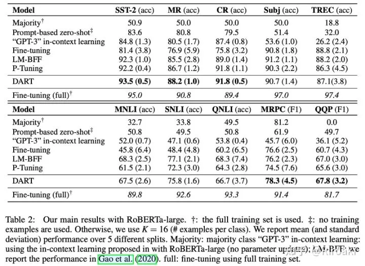 五、小结与展望 本文介绍了DART,一种简单而有效的微调方法,可改进快速学习预训练的语言模型。与传统的微调方法相比,DART可以在少样本场景中产生一定的提升,并对其他语言模型是可拓展的,并且可以扩展到其他任务。本文的实验结果将有助于社区在少样本学习领域和终身学习领域的发展。