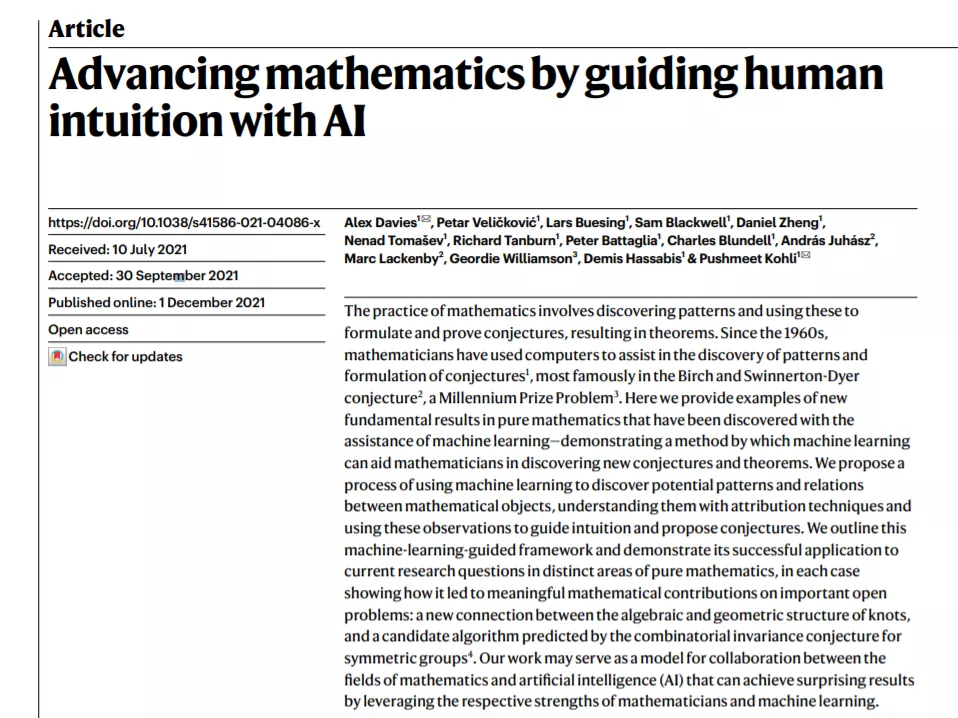 DeepMind作为一家全球领先的人工智能公司,他们探索了机器学习 (ML) 在识别数学结构和模式方面的潜力。现在他们帮助数学家解决了一些数学难题,成为AI首次探索纯数学的前沿研究,相关论文今天已在《自然》杂志上发表。