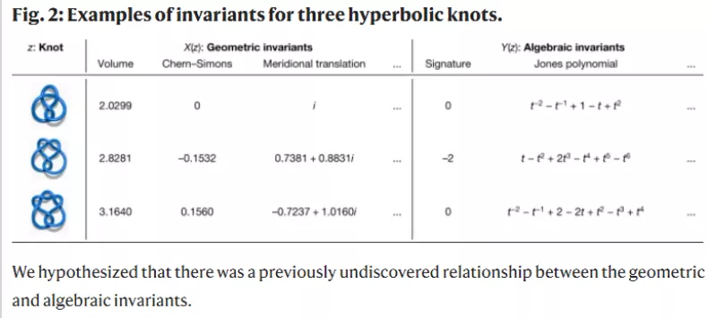 低维拓扑是数学中一个活跃且有影响力的领域,DeepMind发现了纽结代数和几何不变量之间的关系,建立了数学中一个全新的定理。这些不变量有许多不同的推导方式,但DeepMind主要关注两大类:双曲不变量和代数不变量。这两种类型的不变量来自不同的数学学科,因此在它们之间建立联系是非常有趣的。