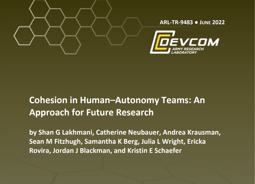 内聚力是团队的一个重要属性,它可以影响个人队友和团队成果。然而,在包括自主系统作为队友的团队中,内聚力是一个未被充分探索的话题。我们研究了关于人类团队内聚力的现有文献,然后在此基础上推进对人类-自主系统团队的内聚力的理解,包括相似性和差异性。我们描述了团队的内聚力,各种定义、因素、维度以及相关的好处和坏处。我们讨论了当团队包括一个自主性的队友时,该元素可能会受到怎样的影响,并进行了逐一描述。最后,我们确定了可能与内聚力有关的人类-自主性互动的具体因素,然后阐述了对推进有效的人类-自主性团队的科学至关重要的未来研究问题。