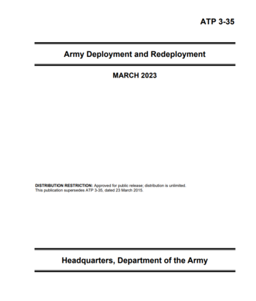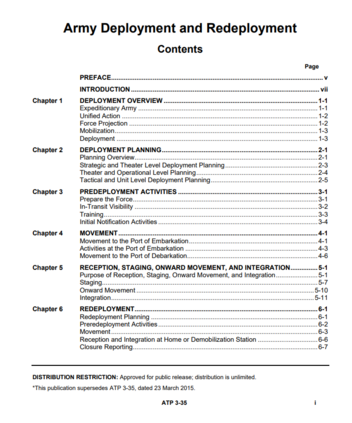 ATP3-35为陆军提供了规划、准备、执行和评估部署和再部署的权威条令。本手册是所有陆军部署和再部署条令的唯一来源。它将在既定的更高层次的陆军条令的约束下,尽可能与联合和多国条令保持一致。本出版物适用于一系列的军事行动,并支持ADP 3-0和JP 3-35。ATP3-35的主要读者是所有军人职业的成员。联合特遣部队或多国总部的陆军指挥官和参谋人员,也应参考有关军事行动范围和联合或多国部队的条令。整个陆军的培训人员和教育人员也将使用本出版物。指挥官、参谋部和下属确保他们的决定和行动符合适用的美国、国际、以及在某些情况下符合东道国的法律和法规。各级指挥官确保他们的士兵按照武装冲突法和交战规则行动。