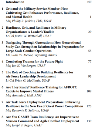 弹性能力在美国空军中被定义为 “适应不断变化的条件,做好准备、抵御干扰并从干扰中迅速恢复的能力”,在过去二十年中,弹性能力已成为空军日益重要的课题。从围绕自杀预防和事后干预所做的工作,到引入 “飞行员综合适应度(CAF)”模式和培养弹性能力,再到创建美国空军综合弹性能力办公室(HAF/A1Z)以领导和整合整个部队的弹性能力工作,以及空军机动司令部的 “战士心理健康 ”倡议等等,空军所做的广泛工作反映出,人们日益认识到有必要有意识地培养和加强空军及其家属的弹性能力。