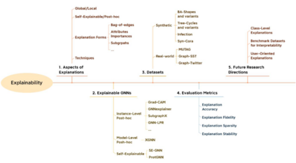 由于复杂图结构的离散型和高度的非线性,再加上 message-passing 机制在 GNNs 中的应用,图神经网络普遍缺乏可解释性。而开发可解释图神经网络(explainable GNNs)是十分关键的。因为提供的解释可以让参与者更信任图神经网络模型所做的预测。并且提供的解释可以用来了解模型所学到的知识,据此我们可以评估现有模型是否带有偏见或者已经被对抗攻击影响。 因此已经有一些工作开展了可解释 GNNs 的研究,我们在这里则对其进行了总结性回顾。对于可解释 GNNs 的讨论框架可见于图 4。其中我们首先对可解释性的应该考虑的各个方面进行了探讨。之后我们对已有的解释 GNNs 的方法分为 实例级事后(instance-level post-hoc),模型级事后(model-level post-hoc)以及自解释方法(self-explainable)。 值得强调的是,其中的 self-explainable GNNs 是一个未被讨论的新方向。因此我们详述了 self-explainable GNNs 如 SE-GNN [4] 和 ProtGNN [5] 的技术细节。对于其他种类的方法,我们根据其采用的方法进一步分为多个子类。由于在现实世界的图中很难获得可以作为检验标准的解释,因此数据集及其评估指标也是可解释性研究的一大挑战。虽然已有人造数据集以及部分现实数据集被应用,但是创造可解释性的基准数据集仍会一个重要的研究方向。更多内容详见我们的综述原文。