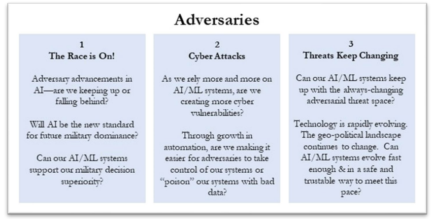 第四个独特的挑战是,对于国防应用,总是需要考虑潜在的对手。在人工智能系统方面,采购界必须注意同行竞争对手国家,他们在人工智能进步方面取得了自己的进步。美国国防系统也必须在这场人工智能竞赛中取得进步。网络攻击在防御系统中总是有可能发生的。随着防御能力增加对自动化和人工智能系统的依赖,这可能会造成更多的网络漏洞。最后,技术正在迅速发展,对抗性威胁空间正在发生变化。国防采购和系统工程界必须确保人工智能系统不断发展和适应,以应对威胁环境的变化,并以可信赖和安全的方式做到这一点。