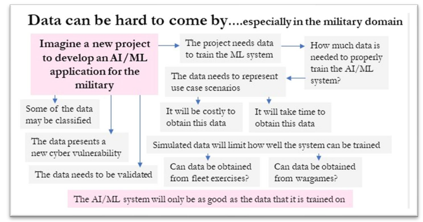 军事领域对开发训练数据集提出了一些独特的挑战——数据可能被分类,数据可能存在网络漏洞(它可能被攻击并被对手故意破坏),如果数据不存在,它可能需要从军事/舰队演习或兵棋推演中获得。数据验证也是一项具有挑战性的工作。