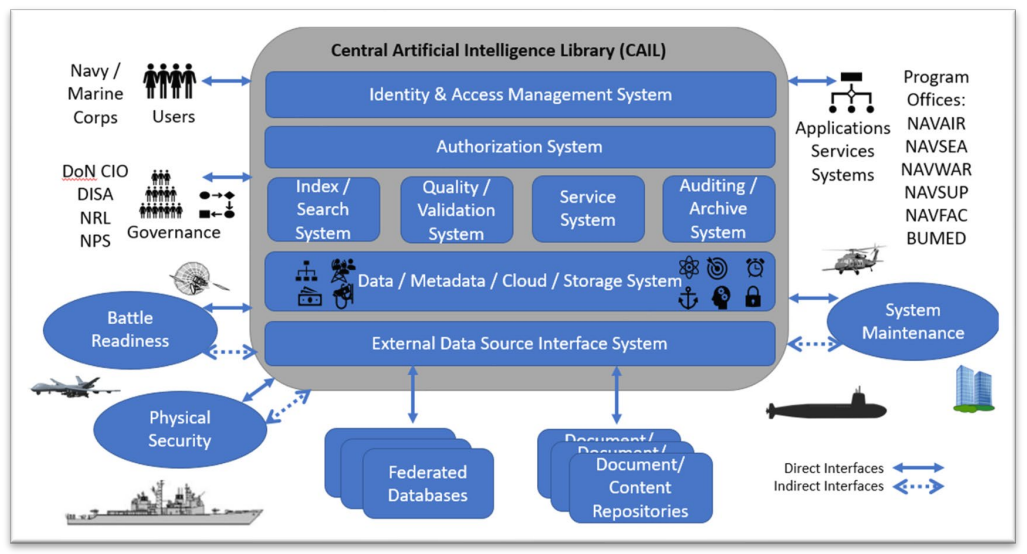NPS 正在为海军的数据管理系统执行需求分析和概念设计,该系统将收集数据并向海军内部许多正在开发 AI/ML 系统的不同组织提供数据(French 等人,2021 年)。图 6 是海军中央人工智能库 (CAIL) 的上下文图,它被设想为一个数据管理系统和流程,用于识别数据集并提供索引、验证、审计和对 AI 可以使用的数据的安全访问。从事海军应用的机器学习开发人员。 CAIL 将不是一个数据存储库或数据库,而是一个中央组织,使 AI/ML 开发人员能够访问经过验证和保护的海军数据——以帮助识别数据集的存在,启用授权访问,并帮助支持开发人员所需的数据尚不存在,需要获得——可能通过舰队演习或兵棋推演。