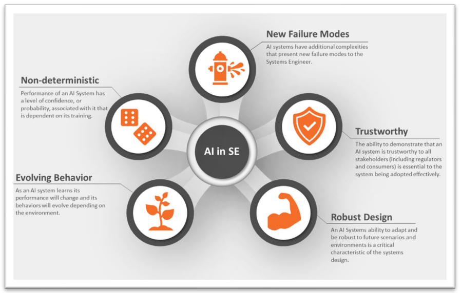国际系统工程师理事会 (INCOSE) 最近的一项倡议已经开始探索需要对系统工程方法进行哪些改变才能有效地开发人工智能系统。图 8 是作为该计划的一部分创建的,旨在强调在 SE 过程中需要考虑的 AI 系统的五个方面。除了不确定性和不断发展的行为之外,人工智能系统可能会出现新类型的故障模式,这些故障模式可能会突然发生,并且可能难以辨别其根本原因。稳健的设计——或确保人工智能系统能够处理和适应未来的场景——是另一个系统工程设计考虑因素。最后,对于涉及更多人机交互的 AI 系统,必须特别注意设计系统,使其值得信赖、可解释并最终对人类决策者有用。
