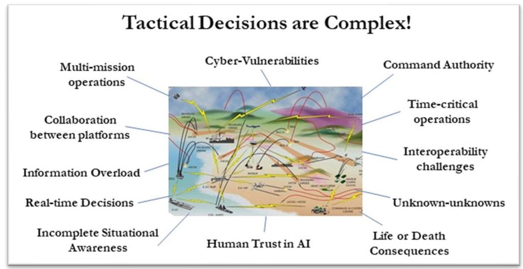 第一个为国防应用实施人工智能系统的独特挑战是战术战争呈现高度复杂的情况。战术复杂性可能涉及信息超载、需要处理的多个并发任务、具有可怕后果的时间关键决策、态势感知的未知/不准确/不完整,以及因各种分布式战争能力所需的互操作性而产生的工程挑战。将人工智能系统添加到这个已经很复杂的环境中是一项必要但极具挑战性的工作。