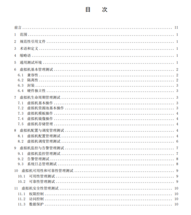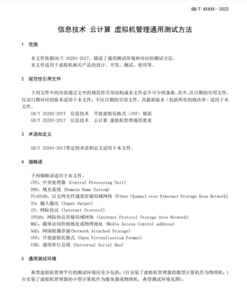 本标准针对信息技术云计算领域虚拟机管理平台通用测试过程中针对不同 虚拟机管理平台测试方法不规范的问题,规定了信息技术云计算虚拟机资源管理 平台通用测试方法。本标准适用于在信息技术云计算中对虚拟机管理平台的通用测试。主要内容包括:a)术语和定义 解释说明虚拟机资源管理平台通用测试方法所涉及的相关专业术语。b)通用测试环境 明确虚拟机管理平台的通用测试环境。c)虚拟机资源管理平台通用测试方法 虚拟机管理平台为实现其业务能力需对虚拟机的各种功能进行管理,实现的 管理功能包括:基本管理、生命周期管理、配置与调度管理、监控与告警管理、 可用性和可靠性管理,安全性管理以及扩展技术要求等。虚拟机资源管理平台通 用测试方法主要提供的是对虚拟机基本管理、生命周期管理、配置与调度管理、 监控与告警管理、可用性和可靠性管理,以及虚拟机性能、压力、容错性和功耗 等进行测试的完整测试步骤。