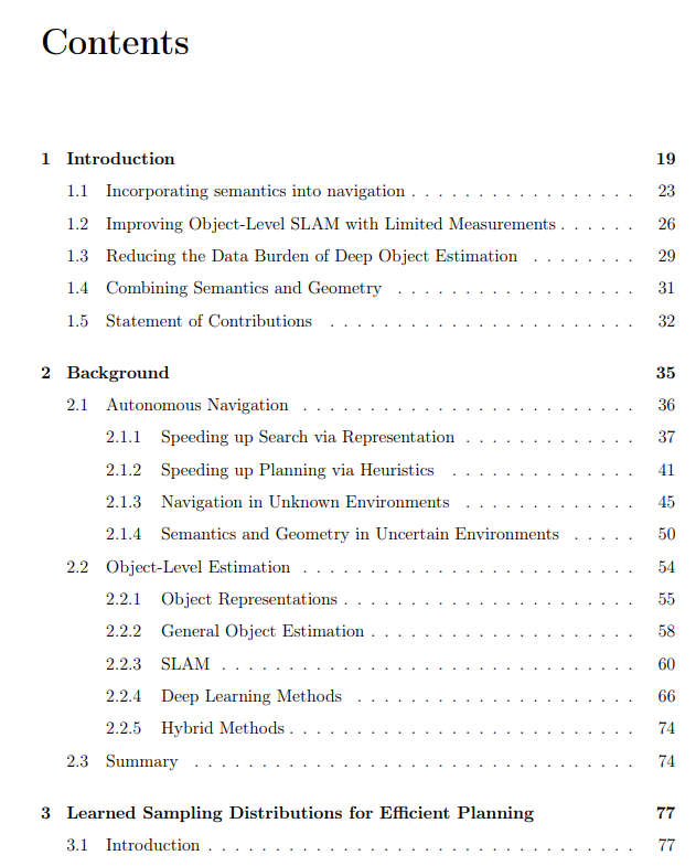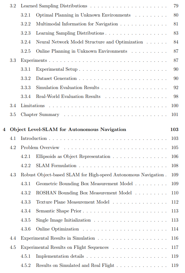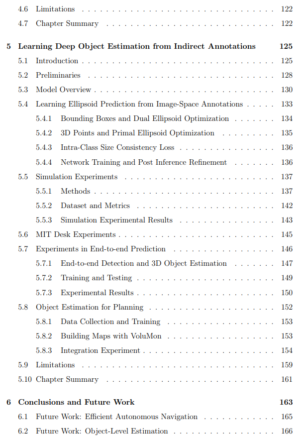 在这篇论文中,我们提出了在新环境中改善自主导航的三个贡献。首先,我们通过将有用的导航行为编码在由部分占有率和对象级地图告知的抽样分布中,来提高新环境中的导航效率。我们认识到,在有效导航时,在有限的视角下,对象层面的估计是具有挑战性的,因此我们还开发了两种在线建立对象层面表征的方法。在我们的第二个贡献中,我们通过引入额外的纹理测量和语义类形状先验,提高了带有椭圆体表征的对象级SLAM的视点效率。最后,在我们的第三个贡献中,我们提出了一种新的深度学习的三维对象估计方法,利用间接的图像空间注释和类内形状一致性来实现从单一的RGB图像的三维对象估计。