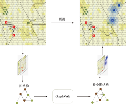 图1 主要工作框架 因此,本文的主要工作包括: 1)对兵棋推演中的态势数据进行预处理,在预处理的基础上,将态势图转化成图结构数据,算子作为图中的节点,算子之间的关联关系作为图中的边属性。 2)把图结构数据应用到图神经网络GraphVAE模型上进行数据信息的补全,重建并生成补全算子关系信息后的图。 3)根据补全后的图结构,预测出敌方算子在地图上的位置坐标范围。