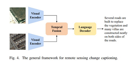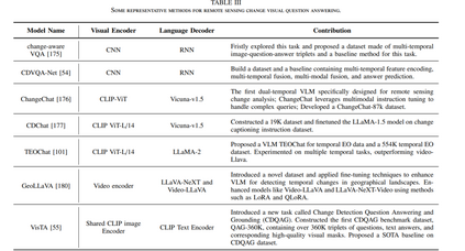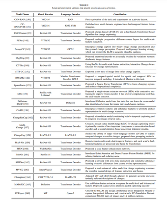 I. 引言遥感技术通过卫星、无人机等各种平台获取地球表面的图像信息【1】–【4】。它在环境监测、城市规划、灾害预警和评估等关键领域中发挥着重要作用【5】–【8】。早期的遥感图像解译主要集中于单时相图像的分析,包括土地覆盖分类【9】、物体检测【11】【12】和语义分割【13】【14】等任务。然而,单时相图像仅反映特定时刻的表面状况,无法捕捉跨时间的动态变化。随着遥感技术和设备的快速进展,获取多时相遥感图像的能力得到了显著提高【15】–【17】。多时相遥感图像提供了不同时间点下某些位置的表面特征信息,为地表变化的动态监测开辟了新途径【18】【19】。这一时序维度至关重要,因为它使研究人员能够分析随时间变化的趋势,从而对环境动态有更全面的了解。早期的时序图像理解主要集中于变化检测技术,通过比较不同时间段的图像来定位变化区域,如植被覆盖变化或新建筑物的出现【20】【21】。然而,变化检测通常仅在视觉层面上检测变化位置,缺乏对变化的更高层次语义理解,如变化对象的类型、变化过程中的状态,以及对象之间的关系【22】–【24】。近年来,像Llava【25】和GPT-4【26】等视觉-语言模型(VLMs)取得了突破性进展,推动了多模态研究领域对视觉-语言模型的关注【27】–【29】。VLMs结合了计算机视觉和自然语言处理技术,能够全面理解视觉和文本信息。与专注于单一图像模态的视觉模型不同,VLMs不仅识别图像中的目标对象,还理解它们之间的关系,生成描述性语言或回答问题。这一能力在遥感领域具有巨大的应用潜力【30】–【32】。在遥感领域,已有研究探讨了各种视觉-语言模型,如图像描述【33】–【36】、视觉问答(VQA)【37】–【40】、视觉问题生成【41】【42】、图像检索【43】–【45】和视觉定位【46】–【48】等。一些近期的研究探索了基于大型语言模型(LLMs)的遥感视觉语言模型,如RSGPT【49】、GeoChat【50】、H2RSVLM【51】、LHRS-Bot【52】和EarthGPT【53】。然而,这些VLMs主要关注单时相遥感图像,无法实现多时相遥感图像的理解。随着VLM的不断发展,针对多时相遥感图像的研究进入了一个新的发展阶段。研究人员越来越多地探索专为时序图像理解设计的遥感时序视觉-语言模型(RS-TVLMs),涉及变化描述【22】【23】和变化视觉问答【54】【55】等任务。RS-TVLMs的研究丰富了时序图像解译的工具。语言作为人类沟通和知识的载体【56】,在融入时序图像分析时能够增强模型的高层次理解。通过将时序视觉信息与语言结合,RS-TVLMs不仅可以识别目标和变化,生成描述性文字,回答相关问题,还能进行多模态交互,从而将时序图像的解译扩展到超越单纯的视觉判断。图1展示了一些具有代表性的RS-TVLM及其发表日期,表明该领域的研究可追溯到2021年。目前,相关研究数量正在迅速增加。尽管RS-TVLMs的研究兴趣日益增长,但系统性的综述仍然较少。现有的许多研究集中于特定任务的孤立方法,这使得研究人员很难全面了解该领域的进展和未来方向。贡献。鉴于RS-TVLMs的快速进展和良好的发展前景,我们撰写了本综述,旨在让研究人员了解基本概念、主要方法、数据集、评估指标及变化描述和变化视觉问答等任务的当前进展。据我们所知,这是关于RS-TVLMs的首篇综述。通过回顾现有研究,我们希望为该领域的研究描绘清晰的路径和未来方向,弥补当前相关综述中的空白,并为遥感时序图像理解的RS-TVLM研究奠定基础。IV. 遥感时序视觉-语言模型目前,遥感时序图像中的视觉-语言理解研究主要集中在几个关键领域:变化描述、变化视觉问答、变化检索和变化定位。这些任务旨在通过多模态建模和语言理解增强遥感时序图像的解译。此外,随着大型语言模型(LLMs)的发展,一些近期的研究探索了将LLMs集成进来,进一步提升遥感时序图像的视觉-语言理解。