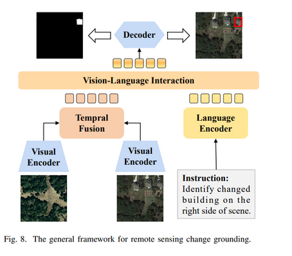 遥感变化定位(RS-CG)旨在在双时相遥感图像中识别和定位由用户提供的查询文本所指示的变化区域。通过将自然语言作为查询模态,RS-CG显著增强了用户交互的灵活性,相比传统的变化检测方法(仅限于固定类别的输出)。RS-CG的输出通常以两种形式呈现:边界框和像素级掩模,如图8所示。 边界框通过矩形轮廓标注变化区域,提供目标变化的直观空间位置。而像素级掩模则提供变化区域形状和边界的精确划分,非常适合细粒度分析。 Irvin等人[101]采用了受LLaVA-1.5[25]启发的模型架构。他们使用时间共享的ViT-L/14对时间变化图像进行编码,通过MLP将嵌入映射后再送入LLaMA-2[107]。LLM输出边界框的坐标,以文本格式有效地将检测到的变化定位到输入查询中。Li等人[55]提出了一种名为VisTA的新型多任务模型,设计用于变化检测问答和定位。VisTA不仅能够回答用户问题,还能同时生成与文本答案相关的像素级变化掩模。文本答案通过双层MLP生成,而掩模解码器由两个注意力模块组成。这种双重输出方法使VisTA能够提供语义和视觉的双重解释,成为RS-CG任务的多功能解决方案。