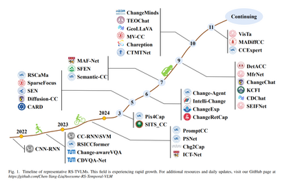 摘要—遥感中的时序图像分析传统上集中于变化检测,即识别在不同时间拍摄的图像之间的变化区域。然而,变化检测仍然局限于其对视觉层面解读的关注,往往缺乏上下文或描述性信息。视觉-语言模型(VLMs)的兴起为遥感时序图像分析引入了一个新维度,通过将视觉信息与自然语言相结合,为时序图像变化的高级解读开辟了新的方向。遥感时序视觉-语言模型(RSTVLMs)允许动态交互,生成描述性字幕、回答问题,并提供对时序图像更丰富的语义理解。这种时序视觉-语言能力对于复杂的遥感应用尤为重要,其中高层次的洞察力至关重要。本文全面回顾了RSTVLM研究的进展,重点介绍了最新的VLM在时序图像分析中的应用。我们对核心方法、数据集和评估指标进行了分类和讨论,突出了时序视觉-语言任务中的最新进展,并概述了该新兴领域的主要挑战和未来研究方向。本综述填补了文献中的关键空白,提供了RSTVLM的综合概述,为遥感时序图像理解的进一步发展奠定了基础。我们将在https://github.com/Chen-Yang-Liu/Awesome-RS-Temporal-VLM上持续追踪相关工作。