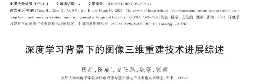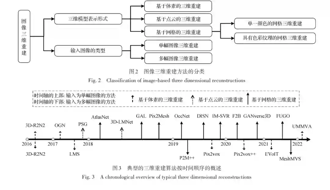 三维重建的目标是从单幅或多幅二维图像中重 建出物体和场景的三维模型并对三维模型进行纹理 映射。三维重建是计算机视觉领域的一个重要研究 方向,利用计算机重建出物体的三维模型,已经成为 众多领域进行深入研究前不可或缺的一部分。在医 疗领域中,利用三维模型诊断身体状况;在历史文化 领域中,将文物进行立体重建,供科学研究及游客参 观。除此之外,在游戏开发、工业设计以及航天航海 等领域,三维重建技术具有重要的应用前景。目前, 研究人员主要利用 3 类方法来重建三维模型,1)直 接操作的人工几何建模技术;2)利用三维扫描设备 对目标进行扫描,然后重建目标的三维模型;3)图像 三维重建,采集单幅或多幅图像,运用计算机视觉技 术来重建三维模型。在上述 3 种方法中,图像三维 重建成本低、操作简单,可以对不规则的自然或人工 合成物体进行建模,重建真实物体的三维模型。传 统的图像三维重建是从多视图几何(Andrew,2001) 的角度进行处理,从几何上理解和分析从三维到 二维的投影过程,设计从二维到三维的逆问题解决方案进行三维重建。传统的三维重建通常需要大量 已知相机参数的图像,并进行相机参数估计、密集点 云重建和表面重建等多个步骤。随着卷积神经网络 (convolutional neural network,CNN)的发展,深度学 习广泛应用于计算机视觉中的各种领域,基于深度 学习的技术方法利用先验知识来解决各种复杂问 题。人们通常能够对物体和场景建立丰富的先验知 识,便于从单一视角重建物体的立体模型,推断物体 的大小和其他视角的形状。深度学习背景下的图像 三维重建方法利用大量数据建立先验知识,将三维 重建转变为编码与解码问题,从而对物体进行三维 重建。随着三维数据集的数量不断增加,计算机的 计算能力不断提升,深度学习背景下的图像三维重 建方法能够在无需复杂的相机校准的情况下从单幅 或多幅二维图像中重建物体的三维模型。 三维模型的表示形式有3种:体素模型、网格模 型和点云模型。体素是三维空间中的正方体,相当 于三维空间中的像素;网格是由多个三角形组成的 多面体结构,可以表示复杂物体的表面形状;点云是 坐标系中的点的集合,包含了三维坐标、颜色和分类 值等信息。三维模型的表示形式如图1所示。 根据三维模型的表示形式可以将图像三维重建 方法分类为基于体素的三维重建、基于点云的三维 重建和基于网格的三维重建。其中,基于网格的三 维重建方法包含单一颜色的网格三维重建和具有色 彩纹理的网格三维重建。根据输入图像的类型可将 图像三维重建分类为单幅图像三维重建和多幅图像 三维重建。图像三维重建方法分类如图2所示。典 型的三维重建算法时间顺序概述如图3所示。 尽管目前已有一些三维重建相关综述文献(郑 太 雄 等,2020;吴 博 剑 和 黄 惠,2020;龙 霄 潇 等, 2021),但已有的综述文献主要介绍传统方法或特殊 物体的三维重建,介绍深度学习背景下的图像三维 重建技术的文献相对偏少。本文主要对近年来深度 学习背景下的图像三维重建的分类和研究现状进行 总结。