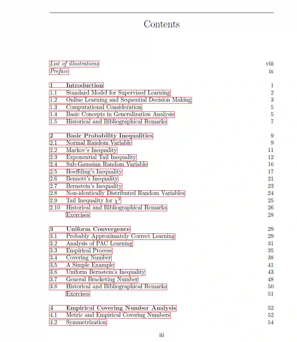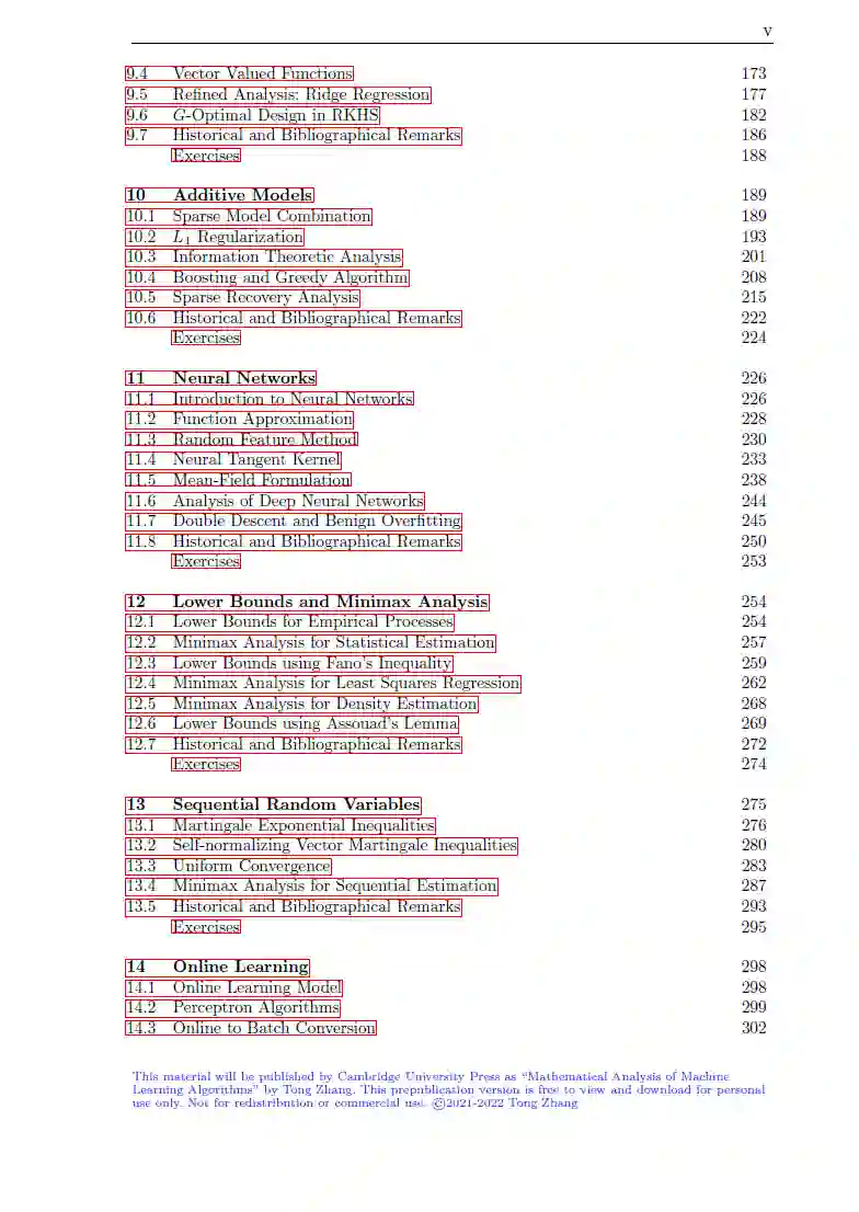 这本书包含两个主要部分。第一部分,从第1章到第12章,涵盖了在独立同分布(iid)设置中监督学习算法的分析。它从独立变量之和的标准指数尾部不等式开始,然后用几章的篇幅发展了均匀收敛的技术工具,这是分析机器学习算法的主要数学机制。使用覆盖数、VC维和Rademacher复杂度等经典概念建立了关键结果。这本书的第一部分还涵盖了最近出现的稳定性分析技术,它可以处理诸如随机梯度下降等特定的学习过程。作为这些基本数学工具的应用,也以不同程度的细节展示了对包括核方法、加性模型和神经网络在内的几种常用机器学习模型的分析。最后,第一部分以第12章的标准下界分析结束,涵盖了常用的技术,如Fano的不等式和Assouad的引理。还提供了关于最小二乘回归和密度估计的示例。这本书的第二部分,从第13章开始,涵盖了顺序统计估计问题的分析,包括在线学习、多臂老虎机问题和强化学习。它从将指数尾部不等式和独立同分布随机变量的均匀收敛分析推广到顺序设置中的鞅开始。然后在后续章节中描述在线学习、多臂老虎机和强化学习的特定算法及其分析。提供了上界和下界。这本书包含足够的材料,可用于为期两个学期的研究生级课程。