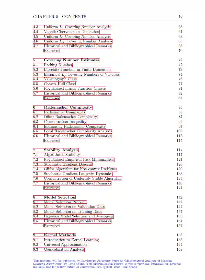 这本书包含足够的材料,可用于为期两个学期的研究生级课程,每个部分的内容可以作为一个学期的课程。它也可以用于一个学期的课程,涵盖书中的部分内容。作者已经根据这本书的内容在香港科技大学教授研究生课程。参加这些课程的学生已经学习了基本的机器学习算法,并希望进一步学习分析这些算法的数学工具。